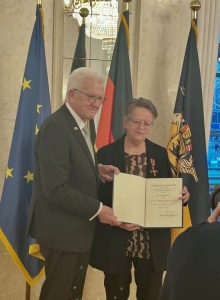Ministerpräsident Winfried Kretschmann verleiht der FW-Ehrenvorsitzenden Sabine Petzold das Verdienstkreuz am Bande des Verdienstordens der Bundesrepublik Deutschland im Neuen Schloss zu Stuttgart